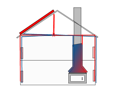 Hemos suprimido el tanque de inercia, donde se acumula la Energia, (Agua caliente) pasando directamente el agua caliente a los radiadores siendo la propia casa, el acumulador de la energía.